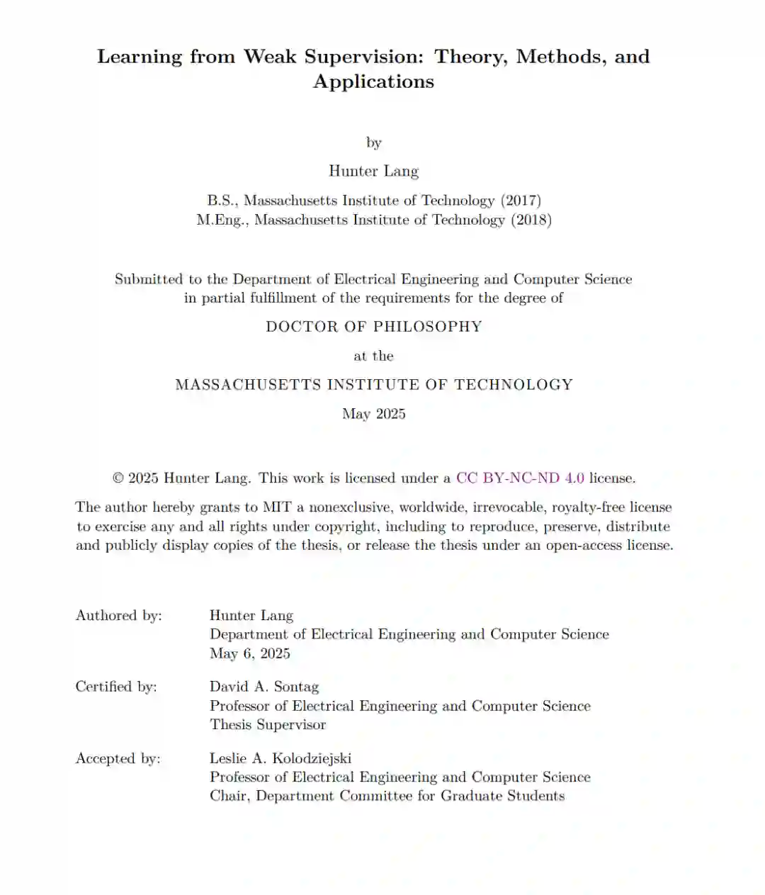 为了训练机器学习模型,对高质量标注数据的需求不断增长,这一趋势推动了弱监督与合成数据方法的广泛采用。这类方法使用自动化模型而非人工来完成数据标注。大语言模型(LLMs)的出现进一步加速了这一进程:其出色的零样本与小样本分类能力,使其能够在多种任务中充当有效的“合成标注器(synthetic annotators)”。 在实际应用中,由这些弱标注器生成的数据往往并不完美,但却能够支持训练出性能强大的模型。然而,从理论层面理解为何使用一个模型的输出作为监督信号来训练另一个模型仍能获得强性能,目前仍然十分有限,尤其是在标注模型在目标任务上本身表现并不理想的情况下。 在本论文中,我提出了一个用于弱监督学习的理论框架,相较于现有的众包标注(crowdsourcing)和噪声标签学习(learning with noisy labels)相关研究,该框架能够更好地刻画问题的关键要素。该理论框架给出了明确的结构性条件,用于解释在何种情况下、以及为何弱监督能够可靠地训练出强模型。 在这些理论结果的基础上,论文的第二部分进一步提出了改进模型从弱监督中学习的方法,并将这些方法应用于**标注数据极度稀缺(low-labeled-data)**的学习场景中。