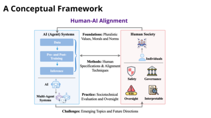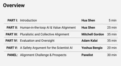 随着通用人工智能系统的迅速发展,使这些技术与人类价值、伦理与社会目标保持对齐已成为一项紧迫任务。传统方法通常将对齐视为一种静态的、单向的过程,而本教程将其重新定位为一种动态的、双向的关系:人在其中与 AI 系统不断相互适应。我们提出了一个结构化的人类–AI 对齐框架,并系统性地探讨如何在整个对齐流程中增强人类能动性。 本教程围绕三个核心领域展开:基础(AI 应与哪些价值对齐?)、方法(如何在系统各阶段赋予人类更大的对齐主导权?)、以及实践(AI 部署会带来哪些社会技术影响?)。课程最终将以一个跨学科专家小组讨论作为总结,四位领先学者将围绕新兴的挑战与未来研究方向展开对话。 本教程旨在为参与者提供关键的概念基础、实用的方法论,以及对不断演进的对齐生态的批判性视角。包括幻灯片、代码资源与录制内容在内的全部材料都将在我们的教程网站上公开获取。