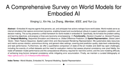 **摘要——**具身智能(Embodied AI)要求智能体具备感知、行动与预测能力,即能够预见自身行为将如何重塑未来的世界状态。**世界模型(World Models)**作为内部模拟器,用于捕捉环境动态,从而支持前向推演与反事实推演,以辅助感知、预测和决策。本综述针对具身智能中的世界模型提出了一个统一框架。具体而言,我们形式化了问题设定与学习目标,并提出了一个三轴分类体系,包括:(1)功能性维度:决策耦合型(Decision-Coupled)与通用型(General-Purpose);(2)时间建模维度:序列化的模拟与推理(Sequential Simulation and Inference)与全局差分预测(Global Difference Prediction);(3)空间表征维度:全局潜向量(Global Latent Vector)、特征标记序列(Token Feature Sequence)、空间潜在网格(Spatial Latent Grid)以及分解渲染表征(Decomposed Rendering Representation)。 我们系统化地整理了跨机器人、自主驾驶与通用视频场景的数据资源与评测指标,涵盖了像素级预测质量、状态级理解以及任务性能等方面。此外,我们对当前最先进的模型进行了定量比较,并总结出若干关键的开放挑战,包括:缺乏统一的数据集与评测基准;需要评估物理一致性而非仅关注像素保真度的指标;模型性能与实时控制所需计算效率之间的权衡;以及在长时序预测中实现时间一致性并减缓误差累积的核心建模难题。 最后,我们在以下链接维护了一个精心整理的参考文献库: https://github.com/Li-Zn-H/AwesomeWorldModels。 **关键词——**世界模型;具身智能;时间建模;空间表征。 1 引言