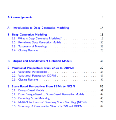 本专著聚焦于塑造扩散模型(diffusion models)发展的核心原理,追溯其起源,并展示不同形式如何从共同的数学思想中演化而来。 扩散建模的起点是定义一个正向扰动过程(forward corruption process),该过程会逐步将数据转化为噪声。通过定义一系列连续的中间分布,这一正向过程将复杂的数据分布与简单的噪声分布相连接。扩散模型的核心目标是构建一个反向生成过程(reverse process),使其能够沿与正向扰动相反的方向运行,从噪声逐步还原出数据,同时复现与正向过程一致的中间分布。 我们从三种互补的视角对这一思想进行形式化阐述: * 变分视角(Variational view):受变分自编码器(VAE)的启发,将扩散过程视为逐步去噪的学习过程。模型通过一系列小的去噪目标(denoising objectives)学习如何一步步将噪声还原为数据。 * 基于得分的视角(Score-based view):源于能量模型(energy-based modeling),学习数据分布随时间演化的梯度,即“得分函数(score function)”,用于指示样本应朝哪些方向调整以进入更高概率区域。 * 基于流的视角(Flow-based view):与归一化流(normalizing flows)相关,将生成视为沿着由学习到的速度场(velocity field)控制的平滑路径,从噪声平滑地迁移至数据。
