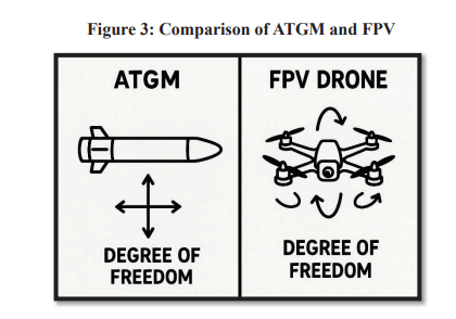 FPV无人机和反坦克导弹(ATGM)都遵循飞行的基本原理(即俯仰、横滚、偏航和油门控制),但由于其设计和目的不同,在敏捷性和控制方面差异巨大。反坦克导弹主要遵循预定路径,机动性有限,仅能进行微小的飞行中修正。相比之下,FPV无人机是完全手动的,并利用六自由度(6DOF),允许进行实时、全方位的动态机动。无人机可以急剧调整俯仰角进行俯冲或掠地飞行,横滚以躲避障碍物,偏航以在飞行中重新调整方向,并通过调节油门实现悬停或立即加速。这种高水平的控制赋予FPV无人机显著的战术优势,尤其是在地形复杂且敌方防御需要高度适应性的高海拔环境中。反坦克导弹由于其可预测性而易受主动防护系统攻击,而FPV无人机凭借其不规则的飞行轨迹和实时操控,更难被跟踪或拦截(Ibrahim A., 2024)。此外,无人机更具成本效益,单价仅低于2.5万卢比,而反坦克导弹则需数十万卢比,同时它还提供双重功能——实时侦察和精确打击(Kozatskyi, 2023)。与反坦克导弹不同,它们不受后喷焰、最小射程或固定弹道的限制。能够重新定位、中止任务或从多角度攻击的能力,使得FPV无人机成为现代战争中一种多功能且经济实惠的选择。步兵在手动操控反坦克导弹时早已运用了飞行原理——如今,同样的本能和技能可以无缝转移到FPV无人机操作上。