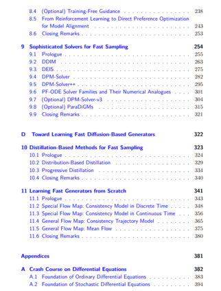 这三种视角共享一个共同的数学骨架:一个随时间变化的学习速度场(time-dependent velocity field),其流动将简单的先验分布传输到目标数据分布。在此基础上,采样过程可以被视为求解一个微分方程,使噪声沿着连续的生成轨迹演化为数据。 在此理论框架之上,专著进一步讨论了: * 可控生成的引导机制(guidance for controllable generation); * 高效采样的高级数值求解方法(advanced numerical solvers for efficient sampling); * 受扩散启发的流映射模型(diffusion-motivated flow-map models),这些模型能够直接学习生成轨迹上任意时刻之间的映射。