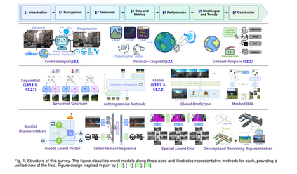图 1 展示了本文的整体结构与分类体系。第 2 节概述世界模型的核心概念与理论基础;第 3 节介绍我们提出的三轴分类体系,并将代表性方法映射到该框架中;第 4 节梳理训练与评估中使用的数据集和指标;第 5 节给出当前最先进模型的定量比较;第 6 节讨论开放挑战与潜在研究方向;第 7 节对全文进行总结。