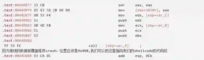 由于返回地址被覆盖,所以我们需要修复堆栈,让程序可以找到自己的返回位置,那么程序就不会crash了,在shellcode代码运行完成后,我们加入以下平衡堆栈的代码,就不会crash了