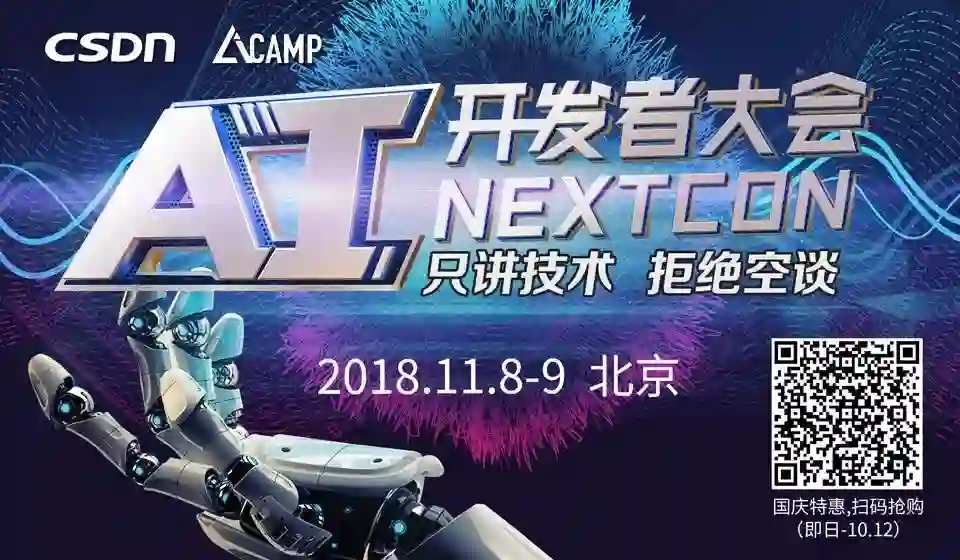 2018 AI开发者大会首轮重磅嘉宾及深度议题现已火热出炉,扫码抢“鲜”看。国庆特惠,购票立享 5 折优惠!