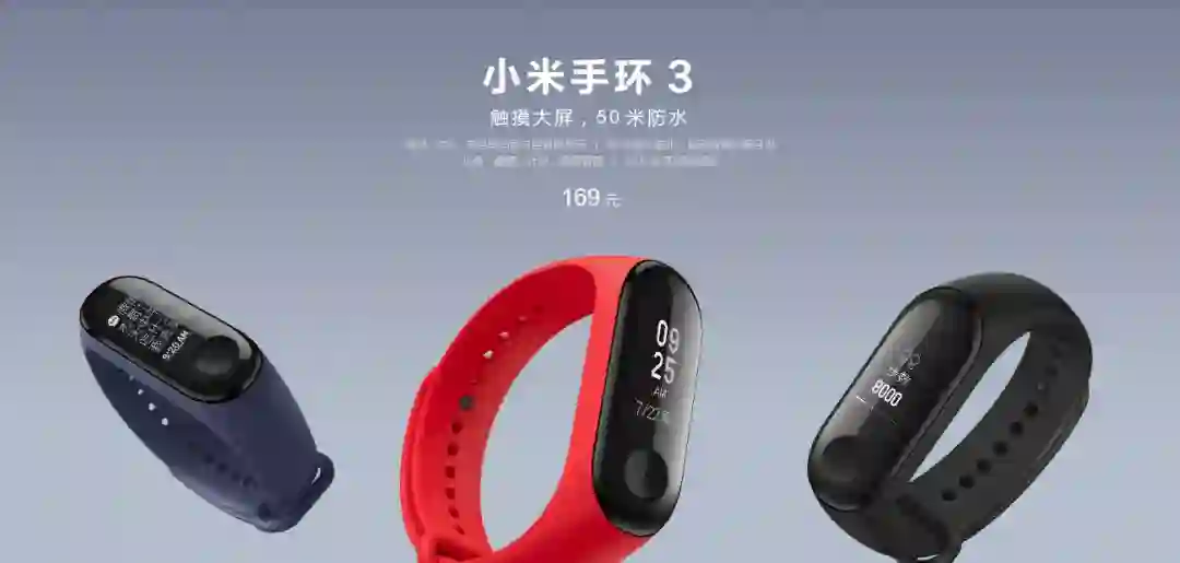 下面是小米手环3,可显示微信、来电等消息内容,振动闹钟,心率计算,步数统计,实时运动数据查询,睡眠质量监测等。