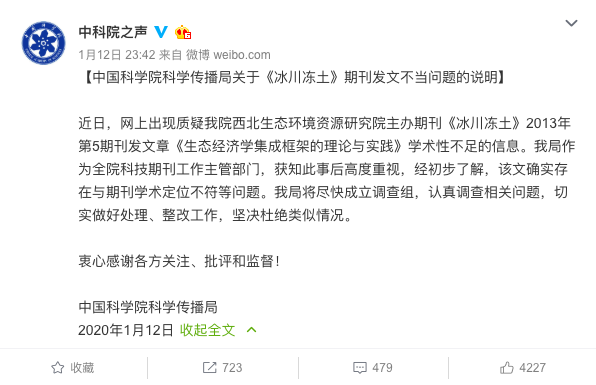 1月12日中午,《冰川冻土》期刊编辑部宣布撤稿,“经报编委会审核,决定对该文撤稿。我刊在该文刊发前审核不严,在此郑重致歉。”