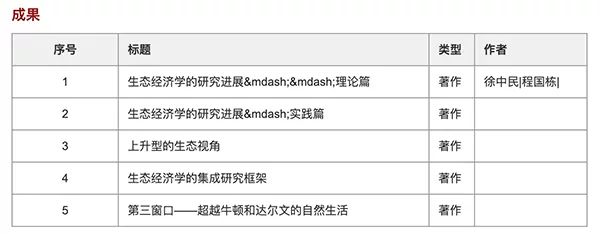 该项目成果包括五方面:生态经济学的研究进展,理论篇;生态经济学的研究进展,实践篇;上升型的生态视角;生态经济学的集成研究框架;第三窗口——超越牛顿和达尔文的自然生活。其中,《理论与实践(I)》、《理论与实践(II)》这两篇论文属于“生态经济学的集成研究框架”成果。