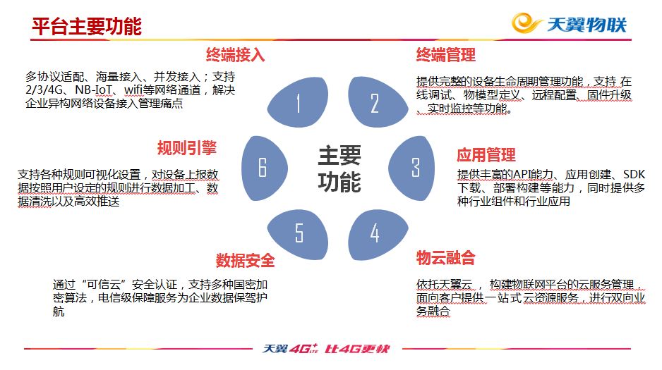 在众多平台提供商中,中国电信一直在试图颠覆这种不合理的现象。与以往不同,平台能力不仅仅是给予物联网技术上的支持,同时平台生态化也在适时的提出。对外汇聚电信内外优质资源,以平台作为生态的载体,对内通过六大核心能力,包括终端接入、终端管理、规则引擎、应用管理、数据安全、物云融合来实现数据变现。