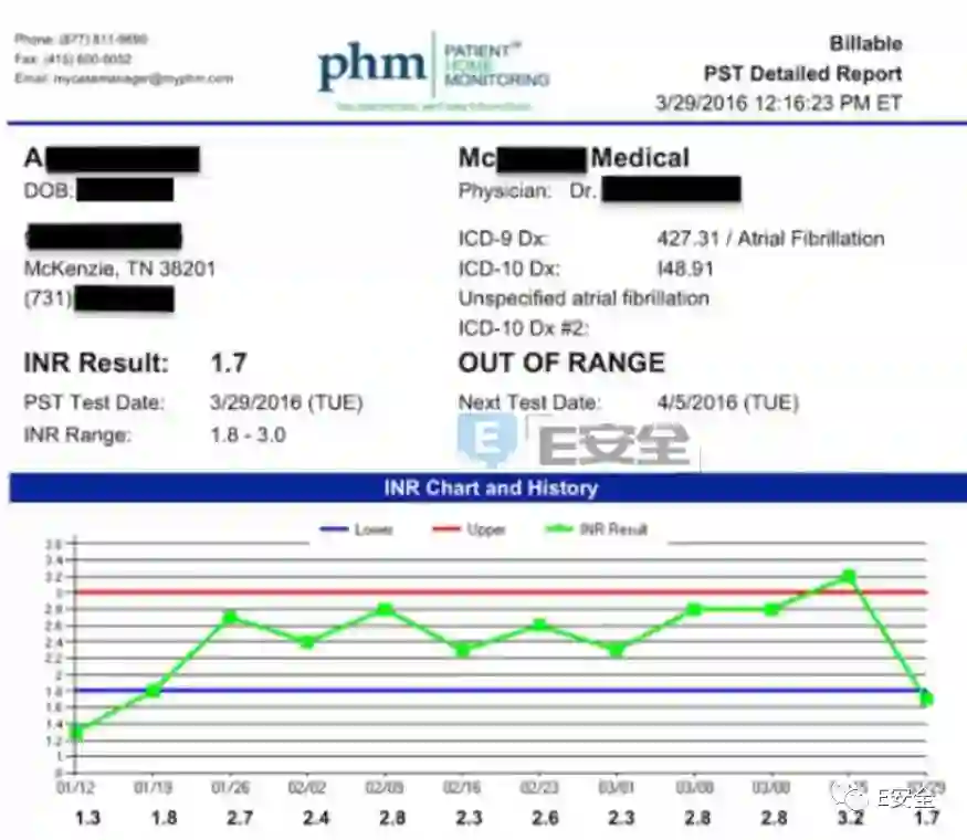 Gizmodo方面审查的泄露记录之一显示,一名居住在田纳西州的患者被诊断患有心房纤维性颤动,属于一种严重疾病,具体症状包括心跳异常(心律不齐),已知可能导致心脏衰竭、中风以及多种其它严重健康风险。记录显示,该患者一直在接受一系列家庭内血液检测,旨在及时向医生报告血块以及由血液稀释药物所引发的意外内出血等问题。