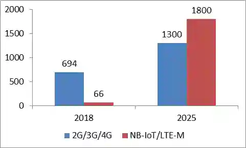 从GSMA的预测数据中可以看出,到2018年底,预计通过2G/3G/4G连接的物联网终端数量为6.94亿,通过NB-IoT/eMTC这些基于授权频谱LPWAN技术连接的终端数为6600万。近期中国移动发布中期报告显示其物联网连接数达到3.84亿,因此在2018年底中国的2G/3G/4G物联网连接数占全球大部分的比例。到2025年,2G/3G/4G物联网连接数会增加到13亿,而NB-IoT/eMTC连接数则增加到18亿。