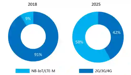 由于传统蜂窝网络仍然承载大量物联网连接,不少需要高带宽的应用需要3G/4G网络连接,加上目前2G网络产业链十分成熟、成本极低,使得2G/3G/4G在未来数年中依然是蜂窝物联网连接的主要承载设施之一,不过其增速比较缓慢,从2018年到2025年的年复合增长率仅为9.38%。而NB-IoT/eMTC则随着产业链的成熟,增长速度加快,在接下来的几年中会实现每年超过60%的增速,使得其占蜂窝物联网连接数的比例从2018年的9%快速增长到2025年的58%,成为蜂窝物联网连接的最主要载体。