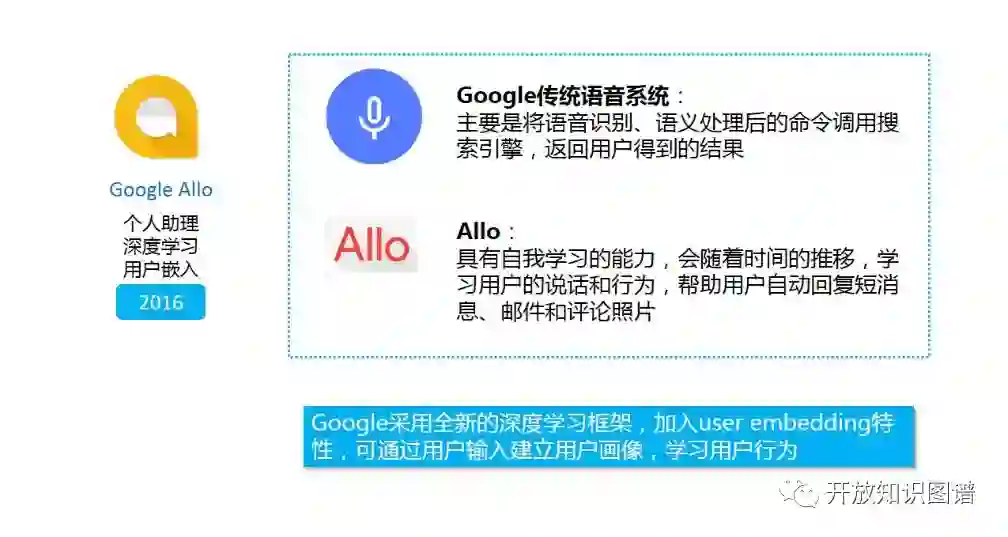 从 Google Now 到 Google Assistant,谷歌一直没有停止过在语音个人助理方面的尝试。这里想介绍一下基于 Google Assistant 的新一代人工智能类微信 IM 应用。Allo 具有几个亮点:首先,其具备一定的自我学习能力。这里包括两方面的学习,一方面是学习用户的习惯,包括说话风格和交互模式。值得一提的是,Allo 的开发者也参与了 Gmail Smart Reply 功能的开发,帮用户草拟回复的邮件。具体来说,根据邮件接收的对象、主题和关联的场景等,根据用户口吻来尽量完成要回复内容。另一方面也包括用户偏好的学习,这一点在推荐系统中是非常重要的,属于用户画像的学习。Allo 学习用户画像的低维稠密向量化表示(User Embedding)。将 User Embedding 加入 Chatbot 的回复生成解码模型中,将有助于回复的相对一致性和个性化。
