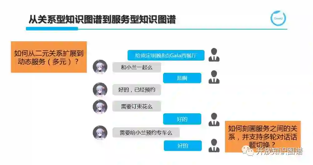 第四,我们发现聊天机器人为了完成很多功能需要对接外部服务或开放 API。此时,图谱就需要从传统的关系型知识图谱(刻画二元关系)扩展到支持动态服务的动态图谱(刻画多元关系,事件属于服务图谱的一个特例)。另一方面,如何刻画服务之间的各种关系(如因果、时序依赖等)也是图谱扩展过程中需要考虑的。例如,当完成了订餐,会有很多 Follow-up 的服务(订花或预约车等)可作为后续服务被消费。建立这些服务之间的关联对于进行精准的多轮对话过程中的场景切换是非常有必要的。