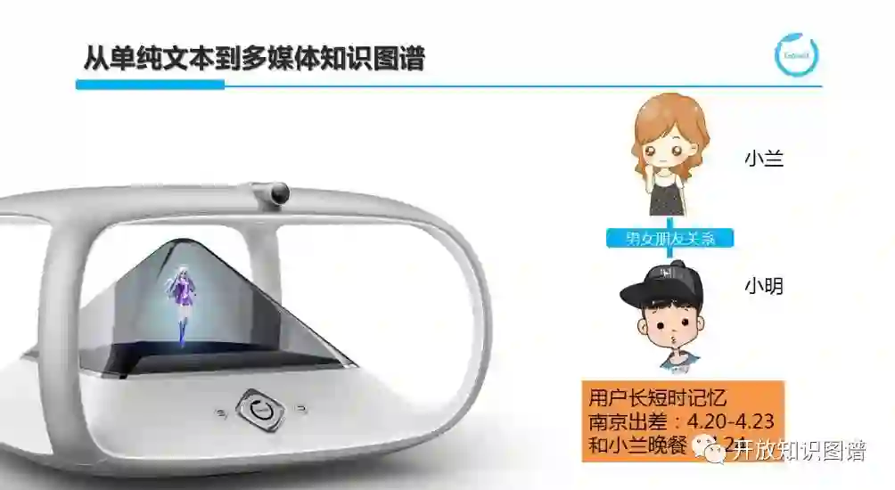 我们接触世界的手段不仅仅是文字,而是结合图像、语音和文字等多模态来了解外部世界的。因此,我们所构建的知识图谱也应该从单纯文本自然扩展到多媒体知识图谱。而 ImageNet 和 Visual Genome 正是这方面的努力。但是这里我想强调的是对于用户图谱这样更新频度非常高且很稠密的 KG,多媒体知识的引入能帮助机器人从更多的维度来了解用户,并提供诸如 Visual QA 等潜在的问答服务。例如,小明正在和琥珀进行交互,通过摄像头识别出当前交互的用户是小明根据小明的图像与用户 ID 的关联,进一步得到其长短时记忆,了解到他在 4.20 到 23 号期间会去北京出差,而 4 月 24 号要和小兰共进晚餐。此时,通过用户图谱中的社交关系了解到小兰是小明的女友,当我们需要进一步了解小兰长什么样时,或者当小兰出现在琥珀面前时,需要可以认出小兰,这时也需要用到我们提到的多媒体知识图谱。