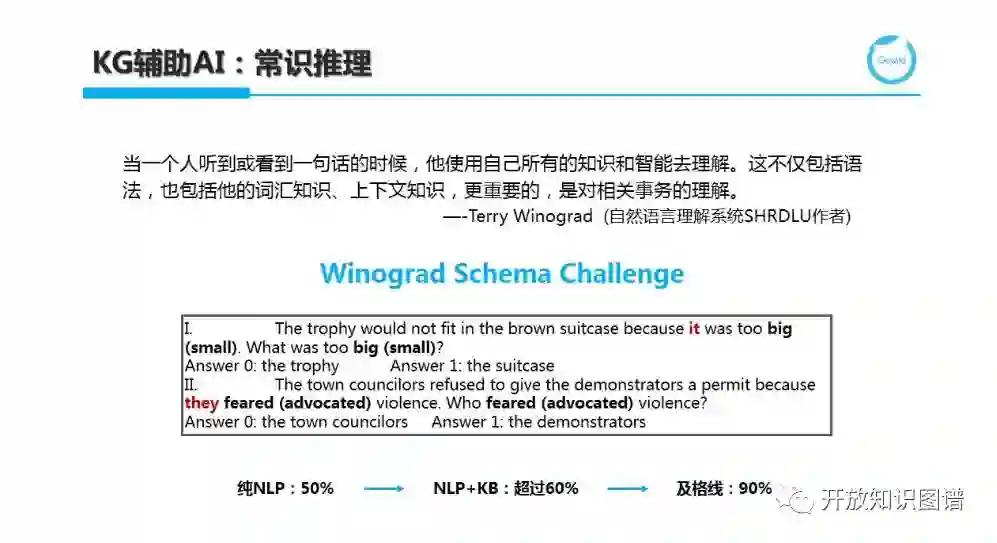 KG 也可辅助通用人工智能(Artificial General Intelligence,AGI),即在常识推理方面起到作用。过去人们常用图灵测试对机器的智能进行评估,近年来,Winograd Schema Challenge 逐渐进入大家的视线。这里举一个指代消解的例子。指代消解是一个经典 NLP 任务,旨在将代词指向具名实体。例如,Thetrophy would not fit in the brown suitcase because itwas too big (small). What was too big (small)? 当我们描述 it 是 big 时,人们很容易理解这时候是在说奖杯(trophy);而当 it 与 small 搭配时,我们也很容易识别出在抱怨 suitcase 太小。这个看似非常容易的问题,却难倒了机器,这是因为人具有非常庞大的世界知识(world knowledge)和常识知识(common-sense knowledge)。当我们仅采用 NLP 技术来努力理解并给出答案时,正确率仅 50%;当结合知识时,正确率提升到了 60%,而及格线是 90%。因此,我们离真正的通用智能还有很漫长的路要走,需要更多的技术突破和数据积累才能完成这项挑战。