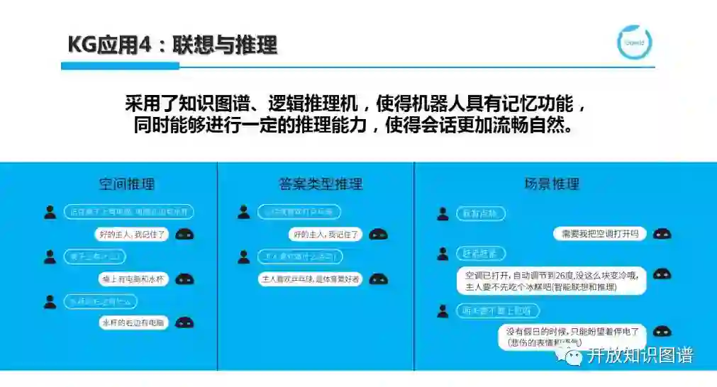桌子上有水杯是通过空间位置的判断得到的。空间推理在地理类问答和智能家居控制等应用中有非常广泛的应用。第二种是答案类型推理。答案类型(Answer Type)作为一种很重要的证据,对问答的准确性有很大的作用。这里的推理包括实例推理(如例子中乒乓球是一种运动)、上下位推理(白色家电是一种家电)和互斥推理(空调和电视没有交集)等。第三种是场景推理,即结合场景业务规则和相关常识知识进行一些联想。例如空调需要一定时间之后才能制冷,而用户在这段时间感到热时可以吃一些冷饮。除了这三类,冲突检测对于聊天机器人尤其是用户记忆很有价值。这里不仅包括前面提及的类别之间的互斥定义,还可以包括关系单值或数量约束,甚至形成很多由推理得到的事实和显式定义的事实组成的冲突关系链。这些对推理机的表达能力提出了更高的要求。
