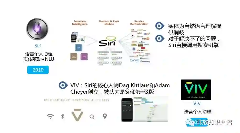 Siri 作为 iPhone 4S 推出时的一个亮点特征,定位是语音个人助理。在推出之时,引起了极大的轰动。虽然这么多年 Siri 的技术也不断提升,但我觉得他更大的价值是作为聊天机器人之门开启的开门砖,教育了用户和市场。回到刚刚的分类,Siri 其实是一个面向特定任务的对话系统。他对接了很多本地服务如通讯录、音乐播放等以及 Web 服务如订餐、订票和导航等功能服务。针对这些服务意图,他通过实体驱动的自然语言理解(Natural Language Understanding, NLU)来识别问句中涉及到的对象和相关服务,从而实现特定任务下的多轮功能交互。对于解决不了的问题,即服务意图范畴外的需求,则直接调用搜索引擎返回相关答案来返回。随后,Siri 的核心人员 Dag Kittlaus 和 Adam Cheyer 于 2016 年推出了 Viv。Viv 被认为是 Siri 的升级版,虽然其在多服务组合,服务编排等方面做了不少亮点工作,但背后的基本原理和定位和 Siri 无差异。