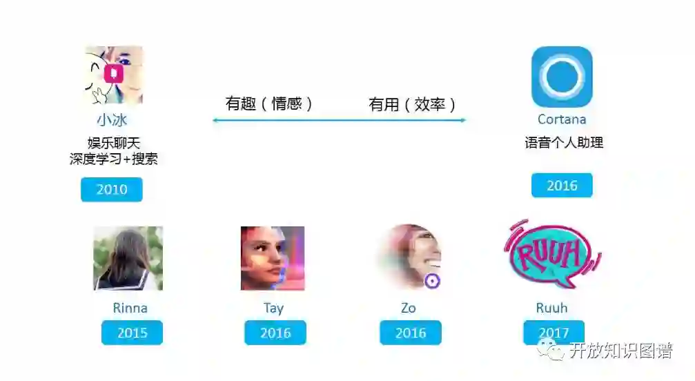 正如之前介绍的那样,微软针对娱乐化和工具化这两个截然不同的定位,分别推出了小冰和小娜(Cortana)。小娜,作为嵌入在 Windows 或 Windows Mobile 等微软操作系统内核的语音个人助理,承载着类似 Siri 或 Viv 的角色,它的目的是提升用户的工作效率,据说 Cortana 有 1.5 亿多用户,这也使得微软吸引到 Bengio 这样的大师作为顾问加入。另一方面,小冰是微软中国团队推出的娱乐聊天机器人。她的人设是一位 16 岁的少女。小冰是一个基于搜索的回复检索系统。通过各种基于深度学习的语义匹配算法,从海量的问答对语料中返回最佳的回复(Message response 而非 Answer)。小冰也会不定期推出新的技能供大家使用,这些技能往往包含了微软团队在图像理解、语音和自然语言理解方面的各种小应用尝试。更值得一提的是:微软针对日本、北美和欧洲等市场陆续推出了具有不同人设的少女如 Rinna、Tay 和 Zo,她们往往可以方便的通过微信、微博或 Twitter 等平台进行交流。
