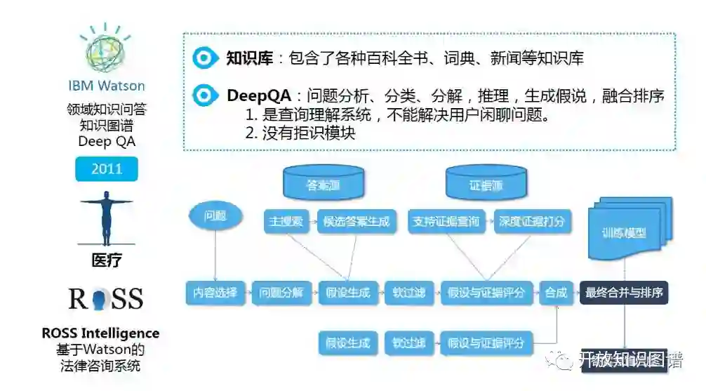 Watson 系统是典型的问答系统,其由 IBM 研究院在 2011 年推出,参加美国知识竞赛 Jeopardy!(危险边缘)并挑落人类冠军而名声大躁。相比 AlphaGo 或早年 IBM 研制的战胜卡斯帕罗夫的国际象棋人工智能程序深蓝,Watson 具有更清晰的商业路径。IBM 斥巨资成立医疗事业部,并与 MD Anderson 等知名医疗机构合作推出面对特定病种(尤其是癌症)的辅助诊断 AI 医生。与此同时,Ross Intelligence 依托 Watson 认知计算平台推出了法律咨询系统。回到技术层面,Watson 所用到的知识库是一个广义的知识库,不仅包含各种结构化知识、也包含各种文本语料和语言学知识。整个流程称为 Deep QA,包含问题分解、假设生成、基于证据的融合排序等关键步骤。这里的 Deep QA 并非指通过深度学习(Deep Learning)技术来提供问答。事实上,Watson 诞生于深度学习大热之前,这里的 Deep 是指通过深度解析(Deep Parsing)来实现对问句的真正理解。