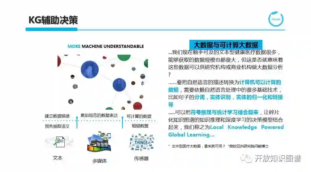 KG 也越来越多地被用于辅助决策。这里无外乎是通过对文本、多媒体和各种传感器产生的原始数据流建立更加规范的数据表达,通过语义抽取、数据链接形成更多机器可理解的语义知识,从而将原本异构分散的各种数据转变为机器可计算的大数据。通过可计算机的大数据,人们更容易发现领域或行业内原先不为人知的规律或一些有趣的模式,从而更好地做出决策。Plantir 就是这方面的成功应用典范,而 ImageNet 及 Visual Genome 等数据项目则极大地推进了图像语义理解和推理的进程。在构建用于辅助决策的知识图谱形成可计算大数据的过程中,如何将符号推理与统计学习有机结合起来,即碎片化的知识图谱上的推理和深度学习决策模型结合起来,形成所谓的 Local Knowledge Powered Global Learning 是非常有趣而富有挑战的研究课题。