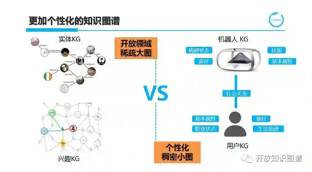 首先,Chatbot 需要更加个性化的知识图谱。除了前面提到的实体 KG 和兴趣 KG 等开放领域的稀疏大图,我们也需要构建机器人 KG 和用户 KG 等个性化稠密小图。机器人或 Agent 需要图谱来建模和展示它的自我认知能力,而用户图谱则可被看作是更精细化的用户画像的知识表现。例如,机器人如“琥珀.虚颜”,有情感状态,喜好,技能等知识维度。同理,用户则需要表达其职业状态和生活轨迹等信息。需要强调的是,无论是个性化小图还是开放域大图,都不是独立存在的,需要将它们融合在一起,才能发挥更大 的价值。机器人喜欢吃的食物则需要和实体 KG 中的食谱图谱关联,而与用户形成经纪人、好友等社会关系,同时爱好方面则和兴趣图谱又关联在一起,可以实现机器人社交、机器人-用户社交和用户社交网络的统一连接。