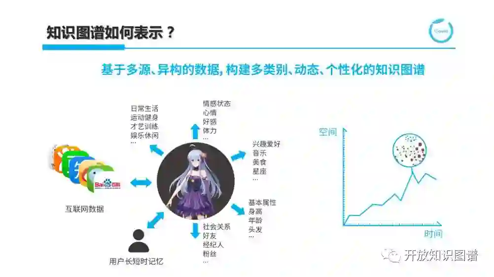 总而言之,我们需要基于不同来源异构的数据来构建包含多类别且体现动态和个性化的知识图谱。这其中包括来自互联网的数据来刻画世界知识,用户数据来刻画画像知识,以及针对机器人的各种基本属性、社会关系、情感状态、兴趣爱好、以及日常生活等静态和动态知识。而我们得到的融合图谱是时空坐标中针对特定交互场景和时间节点的一个镜像。