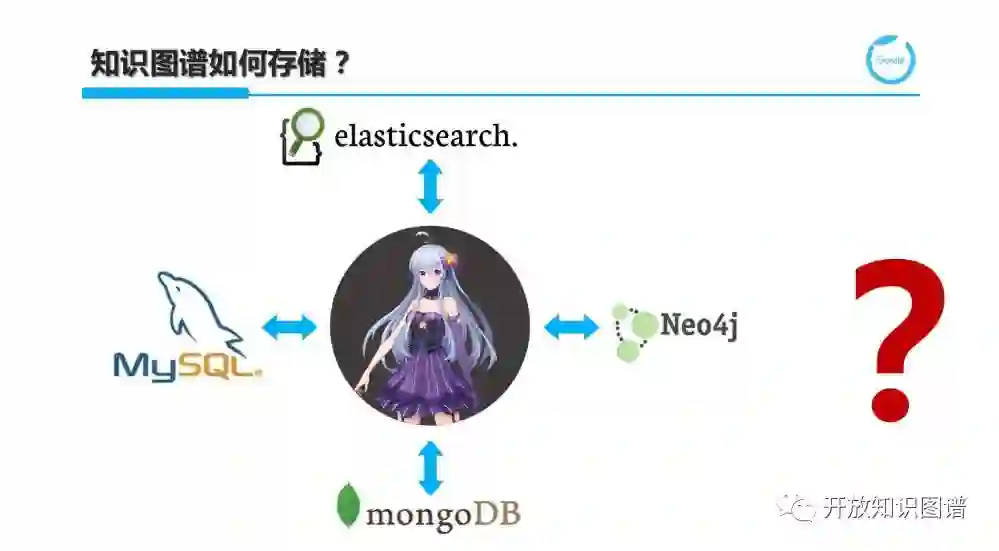 注意:这里所谓的存储,不仅仅是将知识存放的问题,而是考虑存储之后是否可以根据图谱的规模、读写特点和查询推理等基础在线操作的效率等多个因素来考量。MongoDB,作为面向文档(Document Oriented)的 NoSQL 代表,他支持无模式(Schemaless)的数据建模方式,即不要求一开始就将 Schema 都确定,而可以按需进行添加或修改。这对于需求经常变更或一开始对领域不是完全了解的情况下,支持自底向上方式的知识管理。不过 MongoDB 仅支持数据库级别的锁,写入速度受限。对于读并发的提高,可以使用基于数据分片(Data Sharding)的分布式版本。关系型数据库 MySQL 应用广泛,也被用于 Apache Jena(HP 开源的 RDF 数据库)中 TDB 的存储引擎。而 Elasticsearch 支持图谱上的简单模式(如单关系或链式)查询,适合如 Facebook Graph Search 或聊天机器人中大部分口语对话,因此也是面向聊天对话的知识图谱存储方案之一;Neo4j 是知名的图数据库,不同于 RDF 数据库,它的数据模型是属性图(property graph),基于图遍历(graph traversal)来实现各种查询功能,对于大部分熟悉面向对象编程的工程师来说非常容易上手。基于上述任何一个数据库或多个数据库的组合来满足知识图谱的管理都是工程做法。从研究的角度来说,希望做一个统一的存储和查询引擎,需要支持多租户(multi-tenant)环境下的海量个人和机器人知识图谱管理,以及融合个人图谱和全局知识上的查询分解、分布式环境下的查询路由和子查询执行,以及结果融合等操作。