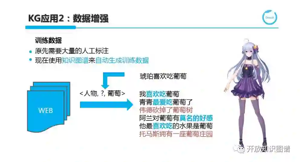 聊天机器人依赖于 NLP,而大量 NLP 任务可转换为有监督的分类或序列标注问题。我们往往会为特定任务下标注数据的缺乏或不充足而发愁,这一点在利用深度学习时尤为严重。这时,也将推出知识图谱的第二个典型应用,叫做数据增强,也就是说 Data Augmentation。具体来说,通过将知识图谱与文本语料库关联,形成大量弱标注数据。这在关系抽取或事件抽取等任务上应用广泛。例如,对于三元组<琥珀,喜欢吃,葡萄>,通过一定的泛化,我们将琥珀转换为 PERSON,即在 Web 上收集 PERSON 和葡萄共现的描述片段,这些描述片段可能代表人物喜欢吃葡萄的特定模式(蓝色例句),也可能代表噪声(红色)。如何通过聚类分析中的异常点检测或噪声建模等方式将弱标注语料中的噪声识别并剔除。当然,包含一定比例的随机噪声,对于模型训练是一定帮助的,可以保证模型具有一定的泛化能力和鲁棒性。使用 Web 作为关联的语料库,主要看中 Web 上描述比较多样化,且信息具有冗余性,可以在保证覆盖率的同时确保数据的分布贴近真实情况。然而对于以语音作为主要交互方式的口语化聊天对话场景,我们仍然需要考虑从 Web 语料上学习到的模式或训练得到的模型如何进一步迁移适配。