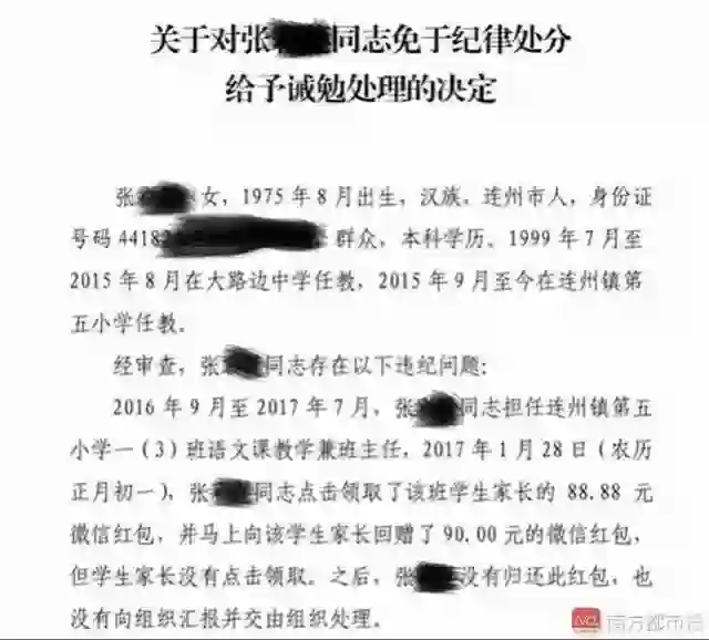 没想到,这名家长竟把张老师收红包的截图发到网上,同时还到当地教育局反映情况,称张老师私下收取家长红包。教育局当天就做了批评和处分: