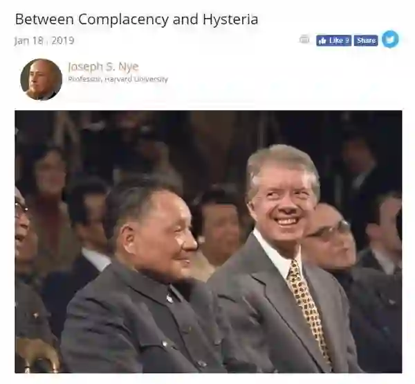 1月18日,“软实力”概念提出者、卡特政府助理国务卿、克林顿政府助理国防部长、哈佛大学教授约瑟夫·奈在《中美聚焦》网站发文,就当前中美关系困境提出自己的看法。