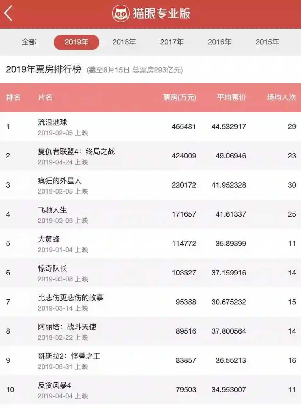 在 2019 年 1 月—5 月上映的影片中,除了《流浪地球》《复仇者联盟 4》等热门电影拿到不错的票房外,其他电影表现均低于预期。票房达 10 亿以上的电影只有 6 部:《流浪地球》(46.5 亿)、《复仇者联盟 4》(42.2 亿)《疯狂的外星人》(22 亿)、《飞驰人生》(17.2 亿)、《大黄蜂》(11.5 亿)、《惊奇队长》(10.3 亿)。