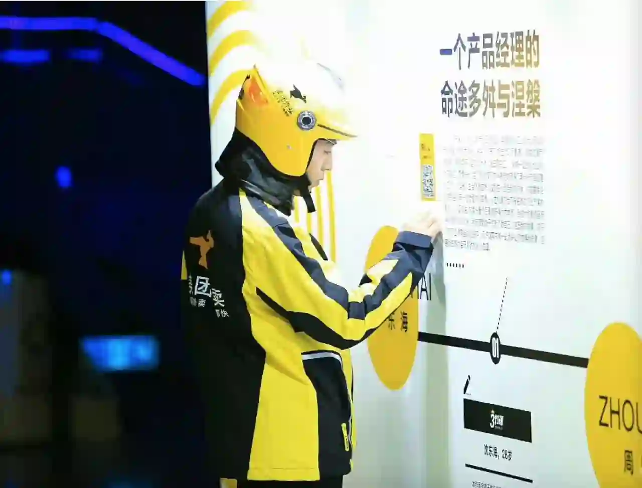 一位外卖小哥,来到学习成果展的现场,与现场部分观众和志愿者进行了交流。并在现场47号展品《一个产品经理的命途多舛与涅槃》面前驻足良久,最后留下了一张纸条。