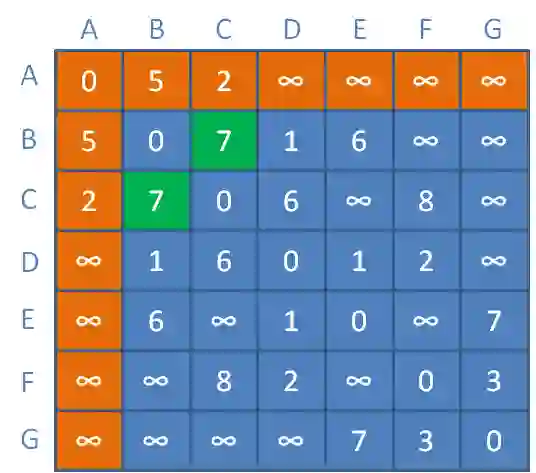 上图的顶点A和顶点C没有直接相连的边,它们之间的直接距离是无穷大。