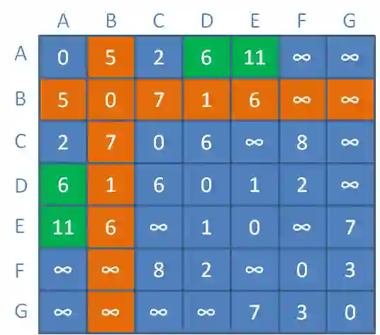 更新对应矩阵元素(橙色区域代表顶点B到其他顶点的临时距离):