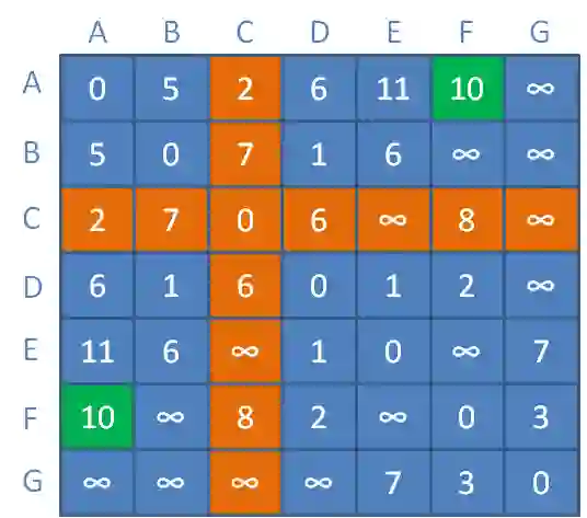 最终,当所有顶点都可以作为中继顶点时,我们的距离矩阵更新如下: