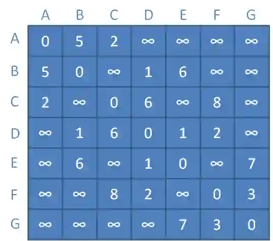 在邻接矩阵当中,每一个数字代表着从某个顶点到另一个顶点的直接距离,这个距离是没有涉及到任何中继顶点的。