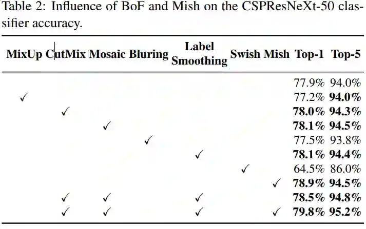 2. 在检测器训练期间,验证了SOTA的Bag-of Freebies 和Bag-of-Specials方法的影响。