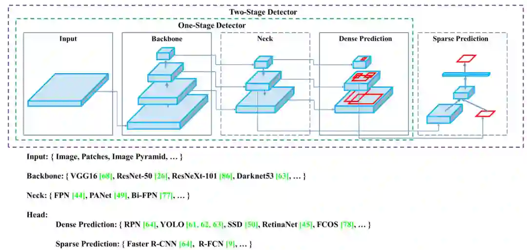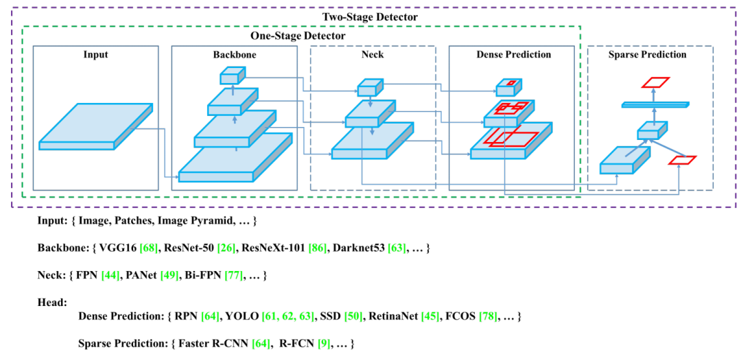 3. 改进了SOTA的方法,使它们更有效,更适合单GPU训练,包括CBN [89],PAN [49],SAM [85]等。文章将目前主流的目标检测器框架进行拆分:input、backbone、neck 和 head 具体如下图所示: