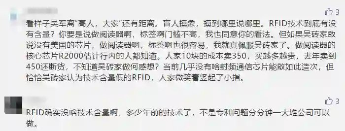 这个话题引发大家热烈讨论,有读者认同吴军的说法:“普通RFID设备技术含量确实不高。”,也有坚决反对“RFID技术含量低”这一论述的从业者,他们认为RFID技术仍然有较高的技术门槛。在超高频(868-920Mhz)RFID应用方面还在不断深入拓展过程中......
