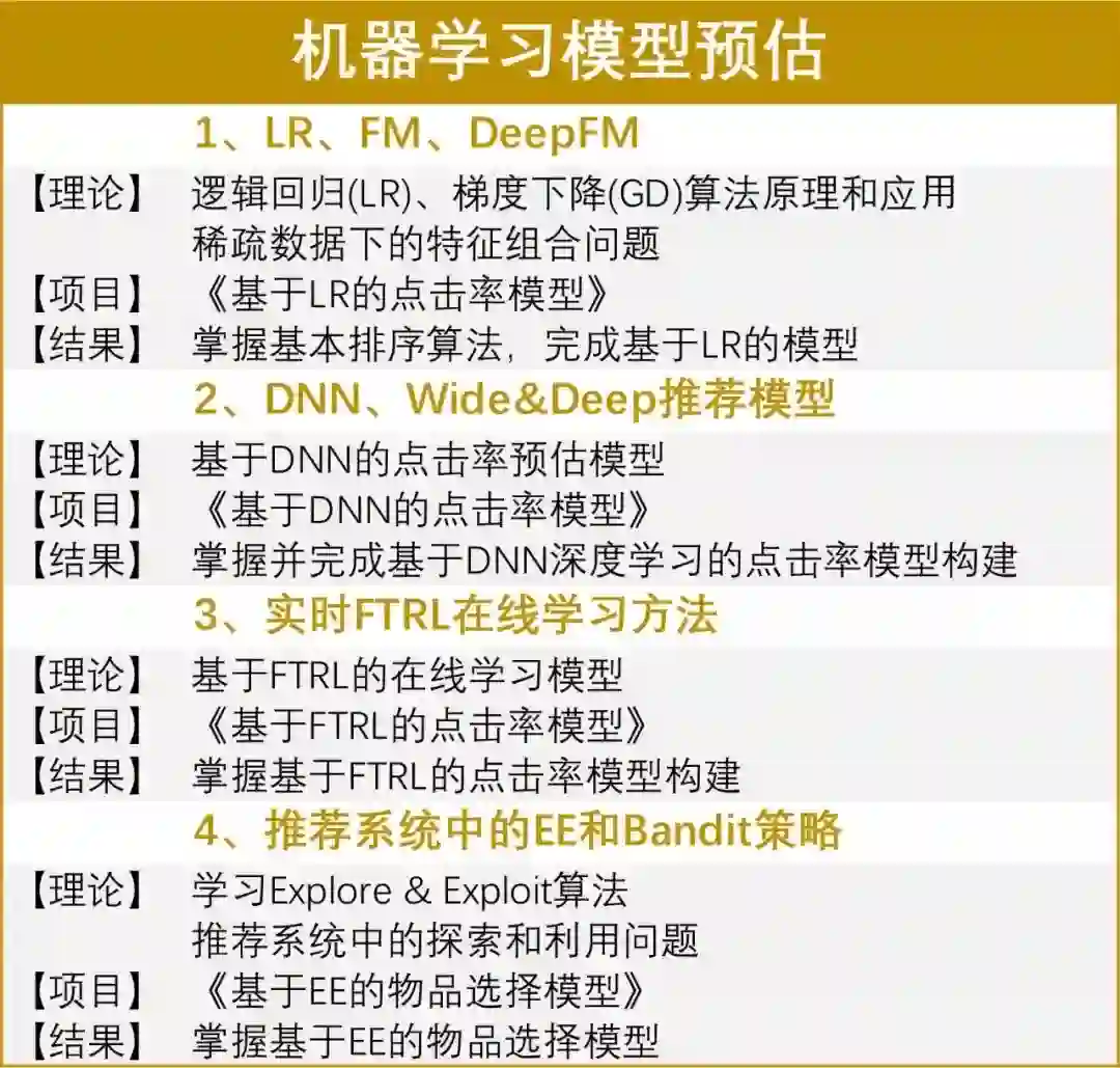 课程以个性化推荐业务方向为中心,系统讲解机器学习、推荐系统、自然语言处理相关技术,比如你将学习