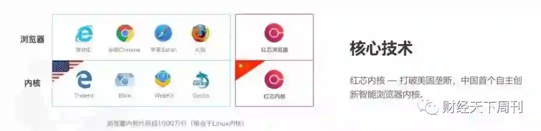 在它官网上,“打破破美国垄断,中国首个自主创新智能浏览器内核”赫然醒目。红芯内核也与Chrome的内核Blink、Safari的Webkit并列。只是浏览器的下载链接已经撤下。