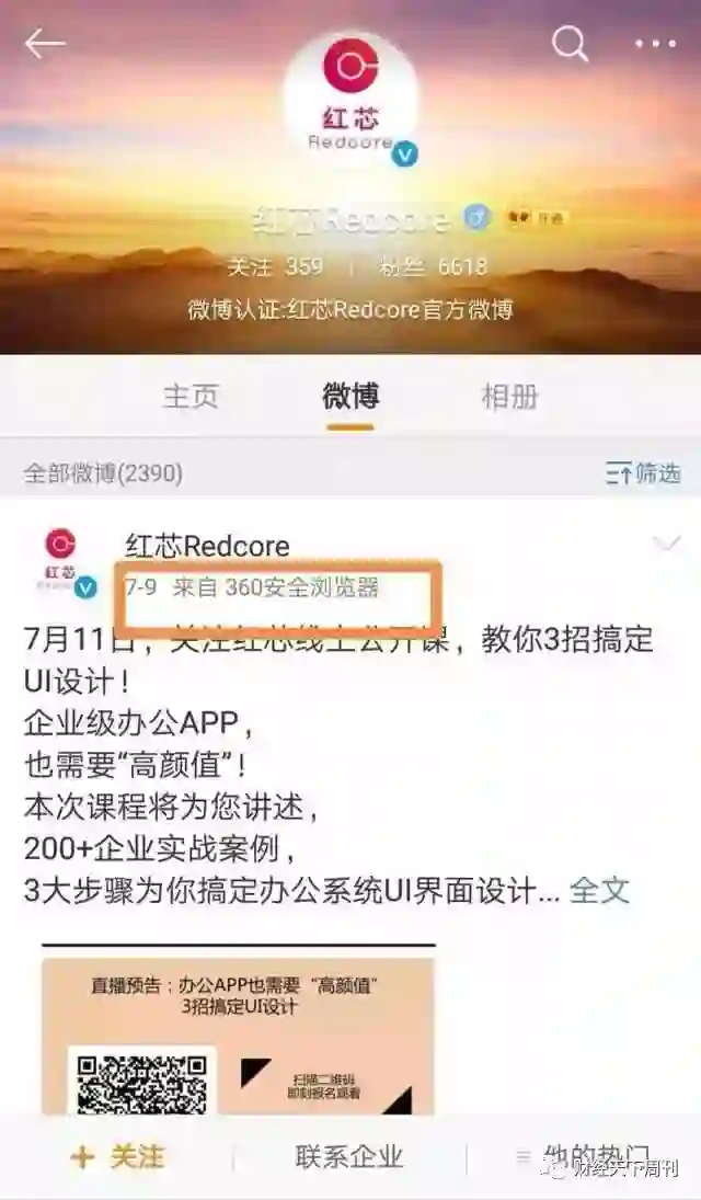 颇为讽刺的是,我们打开红芯企业的官方微博时发现,其官方微博使用的却是360浏览器。