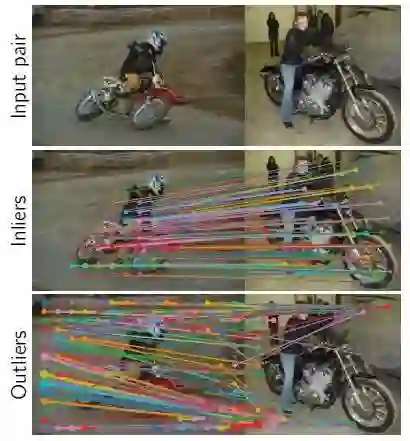 图1 语义对齐示意图,给定输入图像对(顶部),输出图像对的密集语义对应关系以及几何变换(中部),剔除几何不一致的外点(底部)