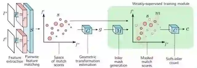 如图2所示,源图像和目标图像(Is; It )通过一个对齐网络,可以得到几何变换g。然后,通过首先找到与几何变换g一致的内点区域m,来计算软内点数(绿色),然后对离散化匹配空间中该区域内的成对匹配分数s求和。软内点数是可微分的,这就允许整个模型可以使用反向传播进行训练。 蓝色表示函数和粉红色表示张量。