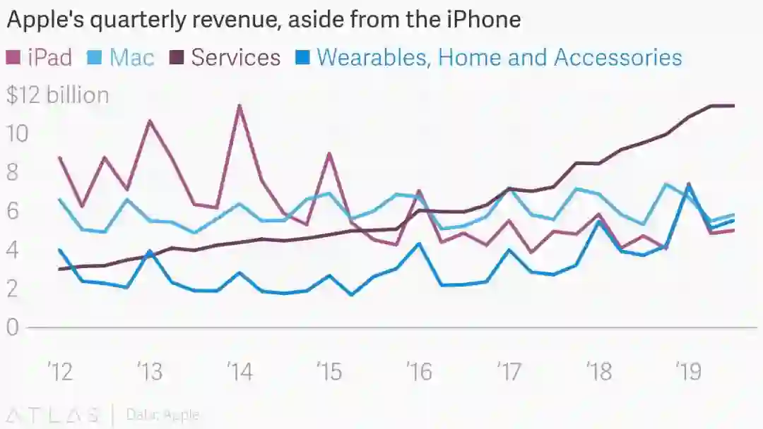 在 10 月底公布的 2019 年第四季度财报数据显示,服务业务是苹果所有业务类型中增幅最快的,达到 125 亿美元,比上年同期的 99 亿美元增长 26%,和同样在本季度获得增长的可穿戴业务一同拉高了第四季度的营收。
