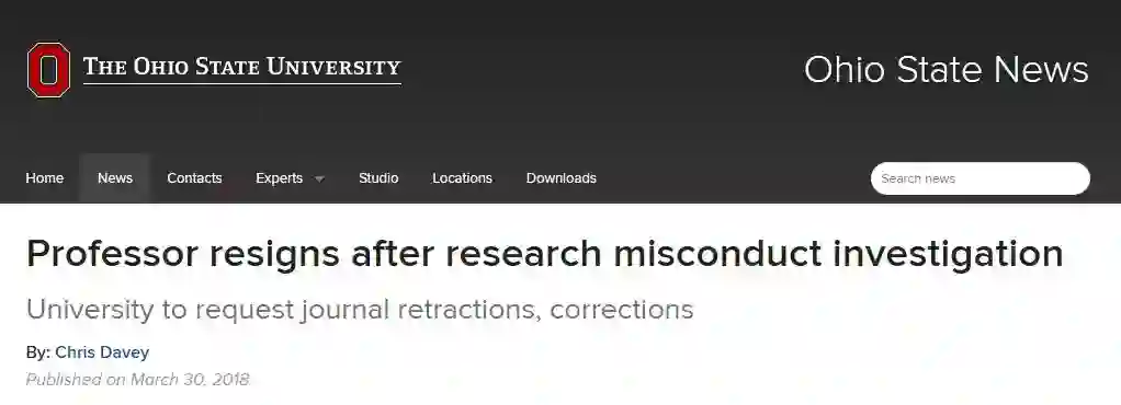 3月30日,国际期刊Science和“撤稿观察网”(Retraction Watch)报道称,俄亥俄州立大学(The Ohio State University, OSU)癌症科学家陈庆士(Ching-Shih Chen)教授因8篇论文中存在学术不端行为(违反图像处理和图片生成规则,并故意伪造数据),从而被俄亥俄州立大学勒令辞职。陈庆士本人也承认了故意伪造数据的事实。