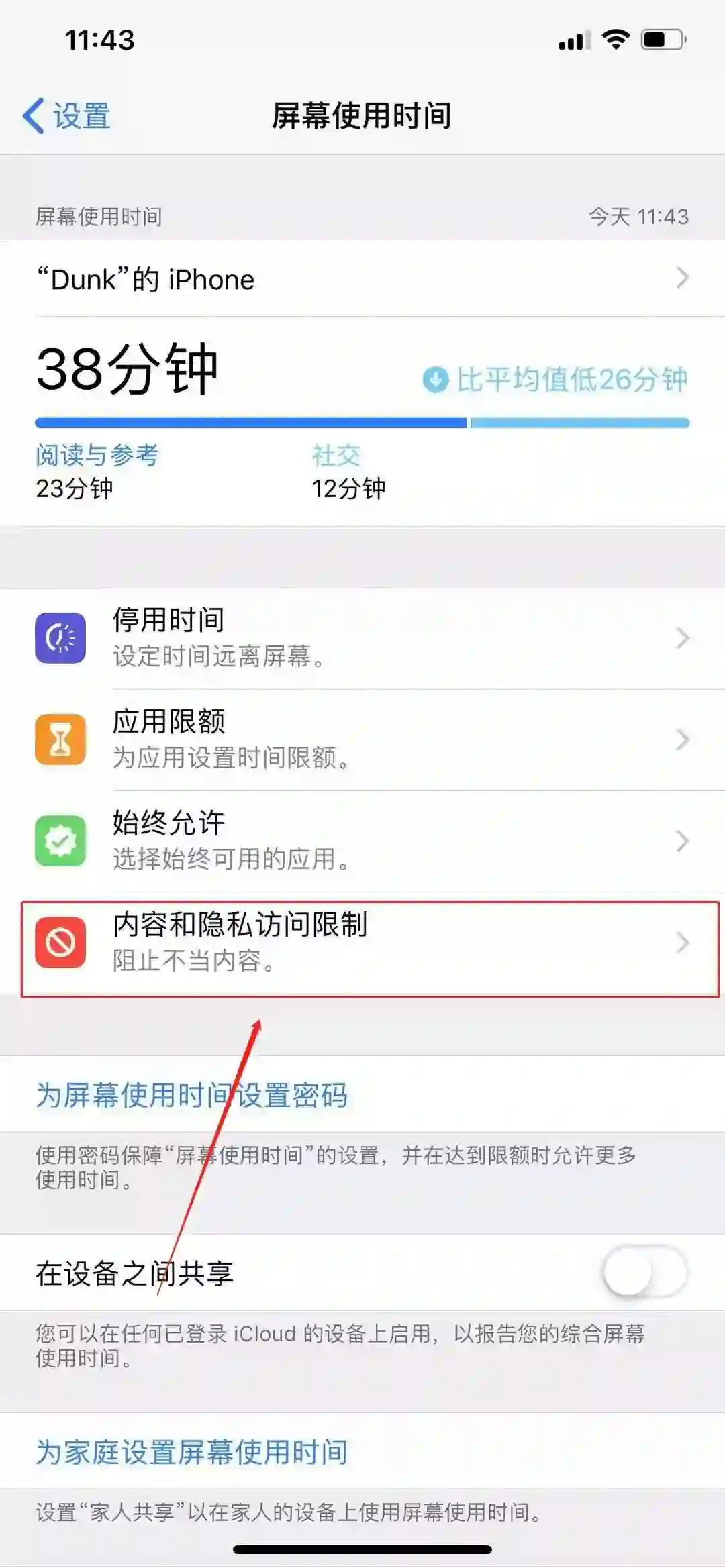 打开 【屏幕使用时间】 里面的 【内容和访问限制】