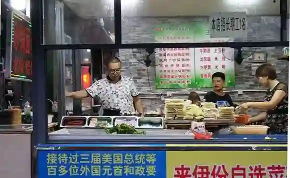 成为的摊前,挂着夸张、滑稽的广告。摄影:杨舒鸿吉